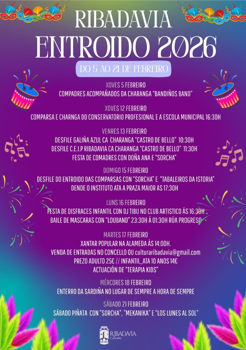 El próximo jueves 5 de febrero, Ribadavia dará el pistoletazo de salida a su esperado carnaval con la celebración del Xoves de Compadres, iniciando así una intensa programación festiva que se prolongará hasta el 18 de febrero con el tradicional Enterro da Sardiña. Durante estas jornadas, la villa se llenará de color, música y alegría, ofreciendo a vecinos y visitantes una amplia variedad de actividades para disfrutar en familia o con amigos.