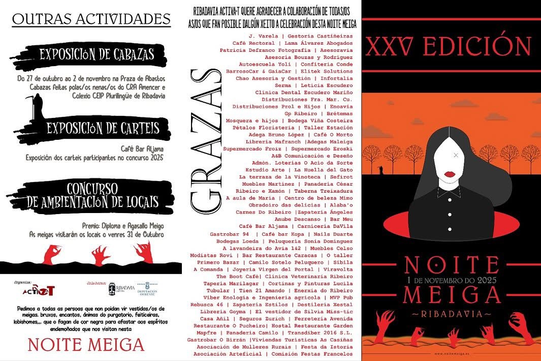 La Noite Meiga es mucho más que una fiesta: es un viaje a las raíces del Samaín, la celebración celta del fin del verano, cuando el velo entre el mundo de los vivos y el de los espíritus se hace más fino. En Ribadavia, este espíritu se renueva cada año con espectáculos, música, fuego, teatro y una ambientación única que envuelve cada rincón del casco histórico.
