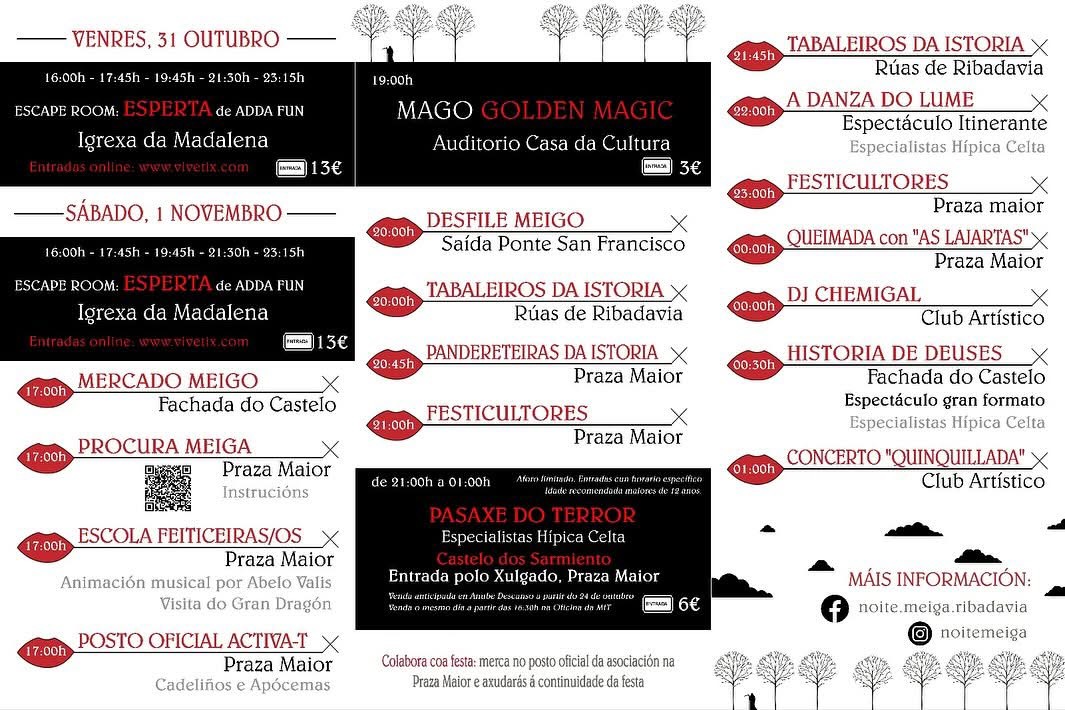 Entre los grandes atractivos de la programación destacan el Pasaje del Terror en el Castillo de los Sarmiento, el Desfile Meigo, los conciertos de Festicultores y Quinquillada, así como las tradicionales pandereteiras y la emblemática Queimada con As Lajartas.